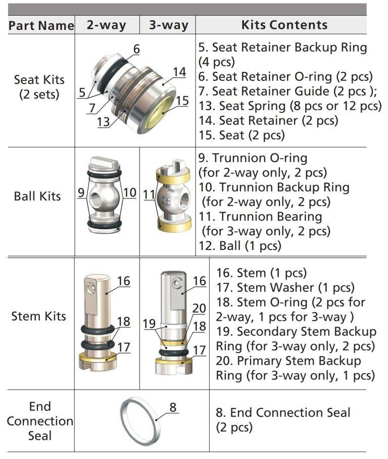Perhatian: Katup dengan dudukan PTFE memiliki 4 pegas dudukan di setiap kit dudukan, sedangkan katup dengan dudukan PCTFE atau PEEK memiliki 6 pegas dudukan di setiap kit dudukan.